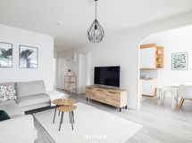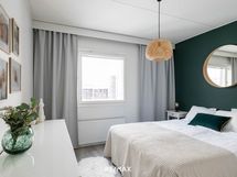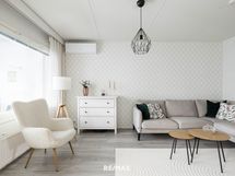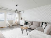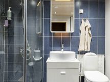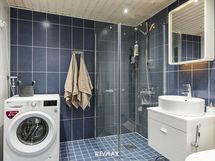 - Pesutilojen varusteet: WC-istuin, suihku, suihkuseinä, pesukoneliitäntä, pesuallas, peilikaappi, bidee-suihku, allaskaappi ja pyykkikaappi. Pesutilojen kuvaus: Kylpyhuone saneerattu asunnon edellisen omistajan toimesta v. 2014. Kylpyhuoneen laatoitus tumman sininen-valkoinen, katossa vaalea puupaneeli. Pesutornille tila.