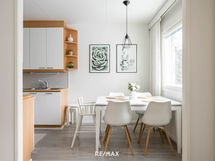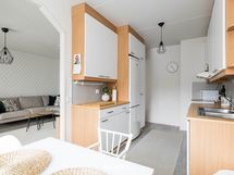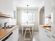 - Keittiön varusteet: Jääkaappipakastin, uuni, liesi, liesituuletin ja astianpesukone. Liesi: Keraaminen liesi. Keittiön kaapistot valkoiset, metallisilla vetimillä. Tasot vaaleanruskeat. Keittiö ns. käytävämäinen, jossa molemmin puolin laskutilaa. Keittiön ikkunan edessä ruokailutila.