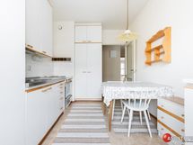 - Olohuoneen ja keittiön välinen seinä on kantava, joten sitä ei voi purkaa pois (ei ole kyllä mitään tarvettakaan, kun on hyvä keittiö asunnossa), mutta todennäköisesti jonkin kokoisen aukon siihen voi tehdä. Tampereen kaupungin rakennusvalvonta opastaa.