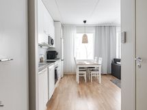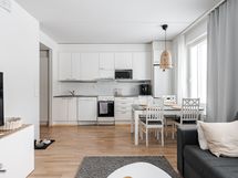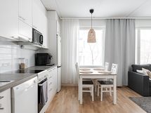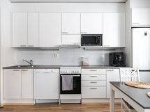- Keittiön varusteet: Jääkaappipakastin, uuni, liesi, liesituuletin ja astianpesukone. Liesi: Keraaminen liesi. Työtason materiaali: Laminaatti.