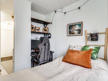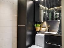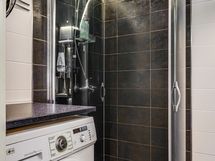 Varustus: Suihkuseinä, wc-istuin. pesukoneliitäntä, allas, peilikaappi, allaskaapisto, lattialämmitys.