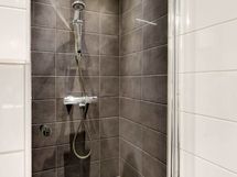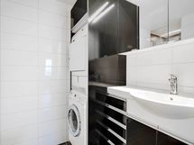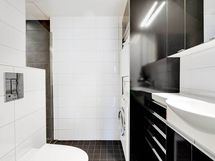 - Kylpyhuone, A la Carte kiintokalusteet, sadesuihku, lasinen suihkuseinä turvalasilla, seinäwc, peili- ja allaskaappi, pesukoneliitäntä (tila pesutornille), lattialämmitys. Lattia: Laatta. Seinät: Laatta