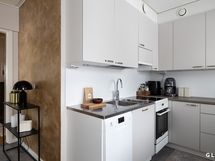 - Varusteet: jääkaappipakastin, astianpesukone. Työtaso: laminaattitaso. Liesi: induktioliesi, liesituuletin hormilla, erillisuuni