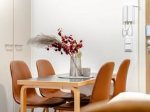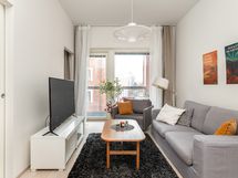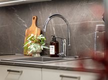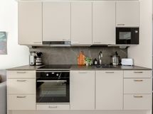 - Liesi: induktio, erillisuuni. Työtasot: laminaatti. Kylmäsäilytys: jääkaappi/pakastin. Varustus: liesikupu, mikroaaltouuni, astianpesukone. Keittiön kaapit ovat matta kashmir MDF ovea ja välitilassa sekä työtasona laminaatti taso, väriltään harmaa marmorikuvio. Jääkaappi/pakastin on rosterin värinen ja astianpesukone on integroitu. Lattia on kovapuulattia väriltään coconut cream 2-säleinen.