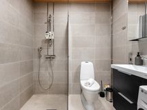 - Pesutilojen kuvaus: Seinät on laatoitettu Oyster 30x60 laatalla, lattiat Sand 10x10. Suihkussa on harmaa suihkuseinä. Allaskaappi ja peilikaappi ovat mustat. . Varustus: suihkuseinä, pesukoneliitäntä, lattialämmitys, wc-istuin, suihku, peilikaappi.