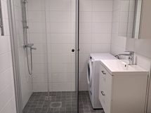 - Pesutilojen varusteet: WC-istuin, suihku, suihkuseinä, pesukoneliitäntä, peilikaappi, pesuallas, allaskaappi, bidee-suihku ja pyyhekuivain. Pesutilojen kuvaus: Juuri valmistunut.