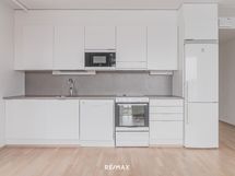 Keittiön varusteet: Jääkaappipakastin, liesi, mikroaaltouuni, liesituuletin ja astianpesukone. Liesi: Keraaminen liesi. Työtason materiaali: Laminaatti.