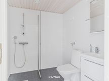 Pesutilojen varusteet: WC-istuin, suihku, suihkuseinä, pesukoneliitäntä, allaskaappi ja peilikaappi.