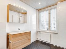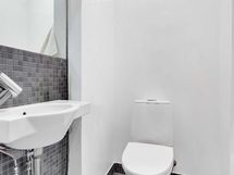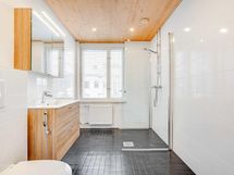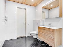 - Kylpyhuone, erillinen wc. Kylpyhuoneessa wc-istuin, suihku, allaskaluste, peilikaappi, pesukoneliitäntä.