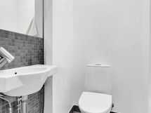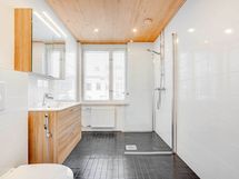 - Kylpyhuone, erillinen wc. Kylpyhuoneessa wc-istuin, suihku, allaskaluste, peilikaappi, pesukoneliitäntä. . Lattia: Laatta. Seinät: Laatta