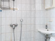 Pesutilojen varusteet: WC-istuin, suihku ja pesuallas.