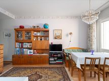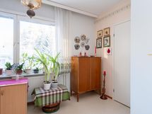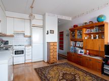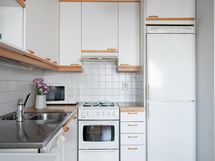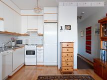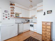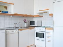 - Keittiön varusteluun kuuluu jääkaappipakastin, sähköliesi, liesituuletin, astianpesukone (käyttämätön) sekä kaapistot.