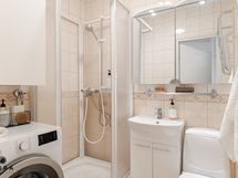- Pesutilojen kuvaus: Suihku, suihkukaappi, pesukoneliitäntä, wc, allaskaappi, peilikaappi ja pesukone.
