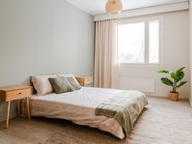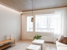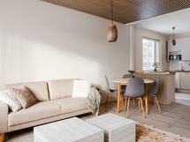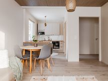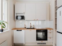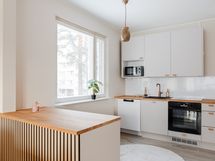 Varustelu: Jääkaappi/pakastin, astianpesukone, erillisuuni, mikroaaltouuni ja saareke. Hybridilattia ja seinät maalattu.
