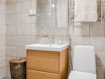 - Pesutilojen kuvaus: Varustelu: WC-istuin, peilikaappi, allaskaappi, pyyhepatteri, suihku, suihkuseinä, bidee, pesukoneliitäntä ja kiinteät valaisimet.