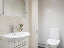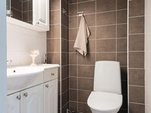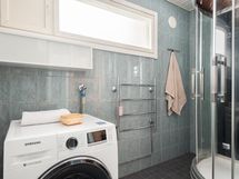 - Sauna, sähkökiuas, kylpyhuone, erillinen wc (2 kpl), suihku, suihkukaappi (höyrysuihkukaappi, radio ym.), peilikaappi (ala- ja yläkerran wc), kaapit, allaskaappi (ala- ja yläkerran wc), pesukoneliitäntä (kph), lattialämmitys (kph), kiinteät valaisimet. Kylpyhuone on remontoitu edellisen omistajan aikana