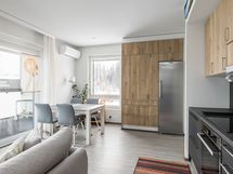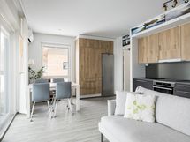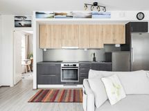 - Keittiön varusteet: Jääkaappi, erillinen pakastin, astianpesukone, erillisuuni (pyrolyysi), liesi ja liesituuletin. Liesi: Induktioliesi. Työtason materiaali: Laminaatti ja komposiittiallas. Topi-keittiöt.