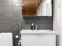 - Varustus: pesukone, kuivausrumpu, pesukoneliitäntä, lattialämmitys, wc-istuin, suihku, kiinteät valaisimet, kylpyhuonekaapisto. Varustus: lattialämmitys, peilikaappi, bidee-suihku.