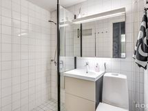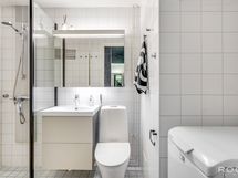 Varustus: Suihku, suihkuseinä, wc-istuin, pesukoneliitäntä, allas, allaskaapisto.