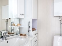 - Varustus: kiinteät valaisimet. Erillisen WC:n kuvaus: Alakerran wc:ssä lämmitettävä pyyhekuivausteline ja allaskaappi. Yläkerran wc:ssä patteri ja kaapisto. Molemmissa kiinteät valaisimet. . Varustus: bidee-suihku.