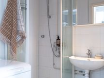 - Pesutilojen kuvaus: Kylpyhuoneen varusteet: suihkukaappi, käsienpesuallas, peilikaappi, wc-istuin, bidee-suihku ja pesukoneliitäntä. .