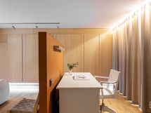 Puustellin koivuviilukaapistot (myös rungot), kivitasot, integroidut kylmäkalusteet ja astianpesukone, rosteriuuni, rosterimikroaaltouuni, keraaminen liesi ja huuva. Pyökkiparketti