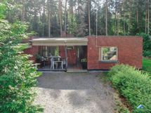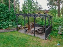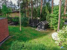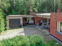 Talo sijaitsee suojaisalla nurmikkopihalla, joka rajoittuu metsään kahdelta suunnalta, tarjoten omaa rauhaa ja luonnonläheisyyttä. Pääoven edustalla on katettu terassi, joka kutsuu nauttimaan ulkoilmasta. Lisäksi autotallin yhteydessä on varastohuone ja puuliiteri.