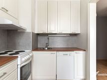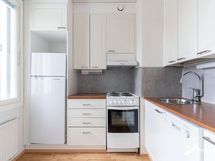 - Liesi: sähköliesi. Työtasot: laminaatti. Kylmäsäilytys: jenkkikaappi. Varustus: astianpesukone, kiinteät valaisimet, liesituuletin / suodatin. Keittiökaappien väliosa laminaattilaattaa. Työtasot alakaapeissa laminaattia.