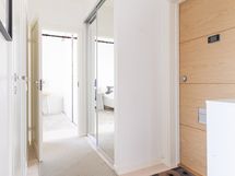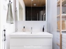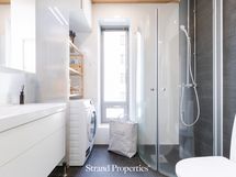 - Pesutilojen kuvaus: Wc-istuin, suihku, suihkuseinä, pesukoneliitäntä, lattialämmitys, peili, allaskaappi, bidee-suihku. Laattalattiat ja kaakeloidut seinät.