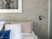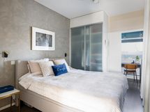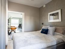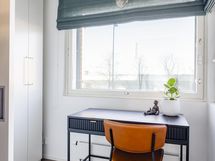 - Makuuhuoneen yhteydessä olevasta vaatehuoneesta avautuu valoisat maisemat kulmaikkunoista kaupungin suuntaan. Säilytyksen lisäksi tämä tila mahdollistaa etätyöpisteen tai mukavan lukunurkkauksen