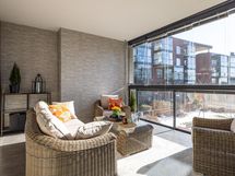 - Huikean tilava läpitalon lasitettu parveke on yksi tämän kodin helmistä. Lasitetulla parvekkeella kesä alkaa aikaisin ja jatkuu pitkälle syksyyn asti. Parvekkeen tyylikkäät verhot kuuluvat kauppaan.
