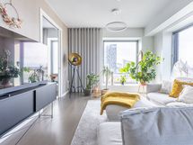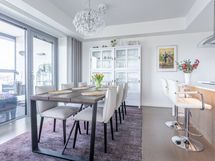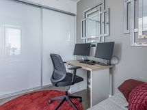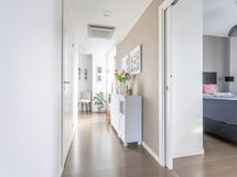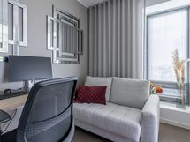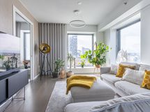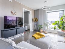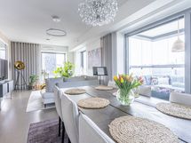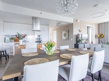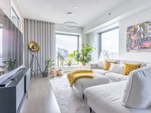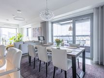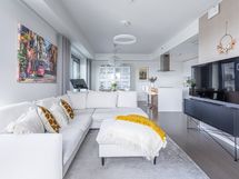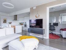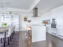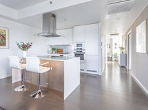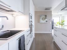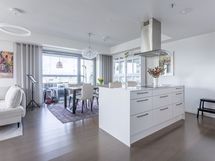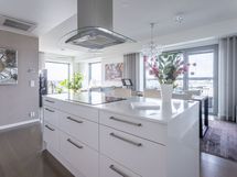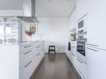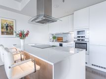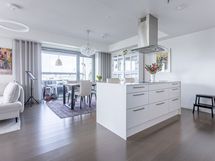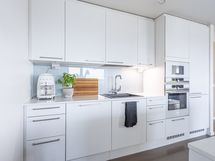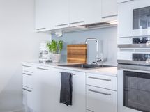 - Keittiön varusteet: Jääkaappipakastin (integr.), astianpesukone (integr.), erillisuuni (integr.), mikroaaltouuni (integr.) ja liesituuletin (aktiivihiilisuodatin). Liesi: Induktioliesi. Työtason materiaali: Kvartsikomposiitti. Tyylikäs ja toimiva avokeittiö.