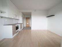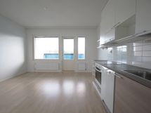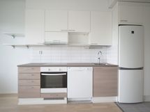 Varusteet: jääkaappipakastin, astianpesukone. Työtaso: laminaattitaso. Liesi: induktioliesi, erillisuuni, liesikupu. Hyvin varusteltu avokeittiö