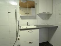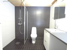 Varusteet: WC, suihku, suihkuseinä, allaskaappi, peilikaappi. Tilava laatoitettu kylpyhuone, suihku, suihkuseinä, tasoon upotettu pesuallas, allaskaappi, työtaso, pesukoneliitäntä, komero, lattialämmitys