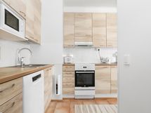 - Liesi: keraaminen. Kylmäsäilytys: jääkaappi, pakastin. Varustus: mikroaaltouuni, astianpesukone, irralliset kaapistot, kiinteät valaisimet, liesituuletin / hormi.