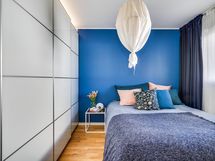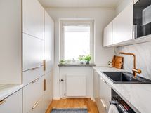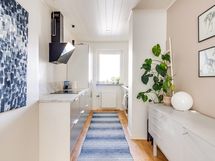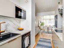 - jääkaappi, pakastin, astianpesukone, Bosch induktioliesi ja uuni, liesituuletin, mikroaaltouuni, aamiaiskaappi. Lattia: Parketti. Seinät: Maalattu