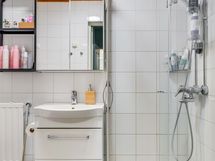 - suihku, taittuva suihkuseinä, wc, allaskaappi, peilikaappi, pesukoneliitäntä, kiinteät valaisimet. Lattia: Laatta. Seinät: Laatta