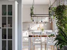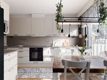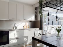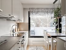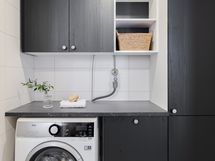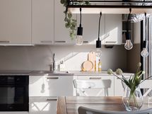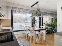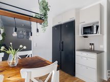 - Liesi: induktio, erillisuuni. Työtasot: laminaatti. Kylmäsäilytys: jääkaappi, pakastin. Varustus: liesituuletin, astianpesukone, kiinteät valaisimet. Välitilassa välitilalevy