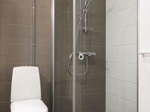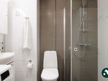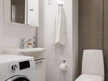 Kylpyhuoneen käytännöllisyyttä lisäävät kaksi kääntyvää suihkuseinää sekä pyykkikaappi.