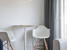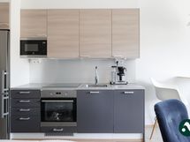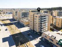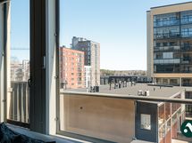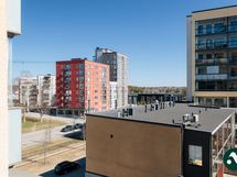 Tämä asunto on kauniin valoisa ja neliöitä löytyy riittävästi, jolloin kalustaminen on helppoa. Keittiön ja eteisen tummat kaapistot luovat asuntoon tyylikkään ja lämpimän ilmeen ja säilytystilaa löytyy poikkeuksellisen paljon. Lattiat ovat jalalle mukavaa parkettia ja näkymä ikkunoista on mukavan avara.