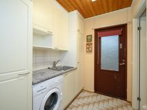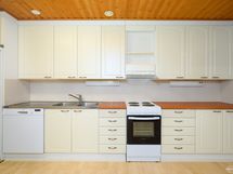 Keittiön varusteet: Jääkaappi, liesituuletin ja astianpesukone. Liesi: sähköliesi. Työtason materiaali: Laminaatti.