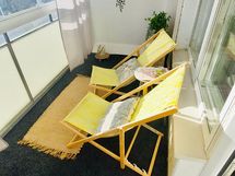 Parveke: Lasitettu, miellyttävät puutasot antrasiitti parvekematolla.