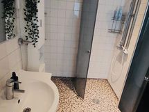 Kylpyhuone: Remontoitu, Vaaleat seinälaatat, vaalea kuultomaalattu katto ledivaloin, kivijäljiltelmä lattia.