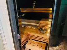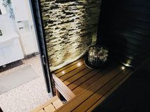 Sauna: Remontoitu, Harvian upotettu kiuas, kivitehoste seinä, ledivalaistus.