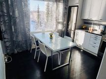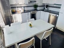 Keittiö: Remontoitu, Teräksiset kodinkoneet, kivijäljitelmä tasot, valkoiset korkeakiilto kaapinovet.