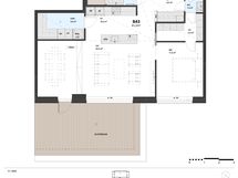 Iso kaksio 6. kerroksessa avoterassilla. Asunnossa makuuhuone omalla vaatehuoneella sekä erillinen kodinhoitohuone. Keittiö saarekkeella olohuoneen yhteydessä ja asunnon erikoisuutena portaan verran korkeammalla oleva ruokailutila.
