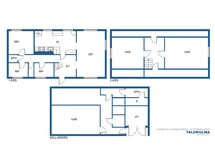 Asuinkerroksessa on tilava eteinen, avara olohuone, keittiö, remontoitu kylpyhuone sekä kolme pienempää makuuhuonetta. Alakerrassa on toinen kylpyhuone jonka yhteydessä on sauna sekä tekniset tilat ja yksi iso varastotila jota voi halutessaan käyttää myös huoneena. Yläkerta on pidetty viileänä tilana ja sieltä löytyy kaksi huonetta sekä kaappitilaa.