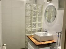 - Suihku, Suihkuseinä, Pesukone, Laattalattia, Halogeenivalot, Laattaseinä