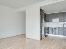 Valkoisen ja harmaan sävyjä yhdistelevässä avokeittiössä kaapistot on asennettu kahdelle seinälle, joten säilytystilaa ja laskutasoa on varsin mukavasti.