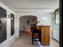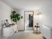 Eteinen, kellarissa askartelu-/oleskelutilaa. Kellarissa oleskelutiloissa lattiat laattaa, seinät maalattuja.